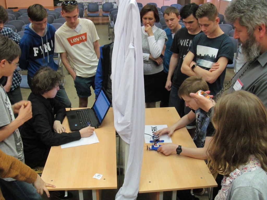 Гостями хакатона были представитель ШНТ (Школа Новых Технологий) менеджер Юлия Боровкова и Василий Зуйков, куратор дополнительного образования Инжинирингового центра НИЯУ МИФИ, руководитель проекта «Сотвори звезду». Наряду с москвичами, в хакатоне приняли участие ребята из Лицея №30 СПб, школ Мытищ и Екатеринбурга разных возрастов и имеющих разные уровни подготовки. Самым продвинутым участникам было предложено запустить дирижабли, с довольно сложным на первый взгляд заданием: подняться в воздух на 1 метр, пролететь 1 метр, развернуться, вернуться на стартовую площадку приземлиться. На самом деле задача решается с помощью 2-х датчиков (дальномер и компас) и 3-х моторов с пропеллерами. На 3-ри приготовленных комплекта деталей для дирижаблей, нашлось всего 2-е команды (СПб и Мытищ). Остальным были предоставлены детали для изготовления мобильных роботов, двигающихся по извилистой черной линии на белом поле. Поля использовались от соревнований Робофест и RobotChallenge, отличающиеся шириной линии (5 см и 1,5см) соответственно, а также кривизной поворотов.