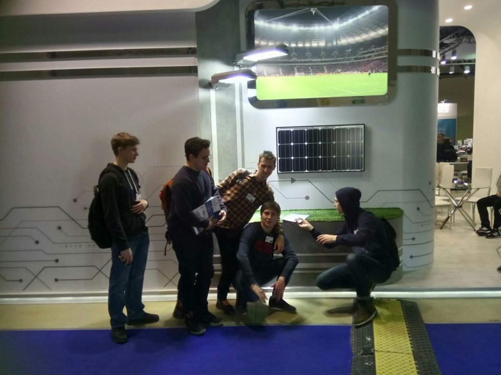 Студенты группы ТР-62 около стенда «Специальные системы. Фотоника»