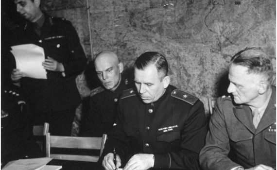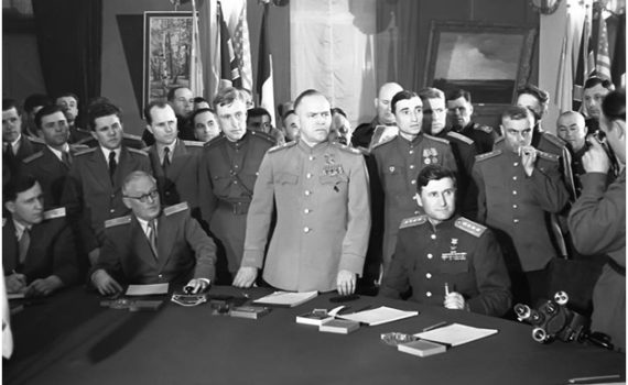 7 мая 1945 года. 1416-й день войны Реймс. В 2 часа 41 минуту, в штабе верховного главнокомандующего союзными войсками в Европе, начальник штаба оперативного руководства вермахта подписал Акт капитуляции Германии. Согласно реймскому акту объявлялось о безоговорочной капитуляции всех сухопутных, морских и воздушных вооружённых сил, находящихся в момент подписания протокола под германским контролем. Командующий […]