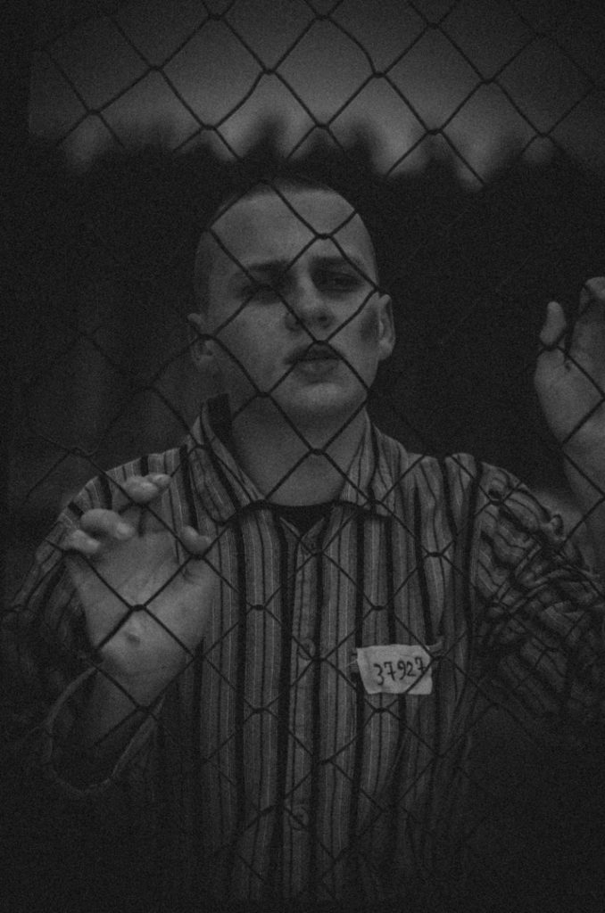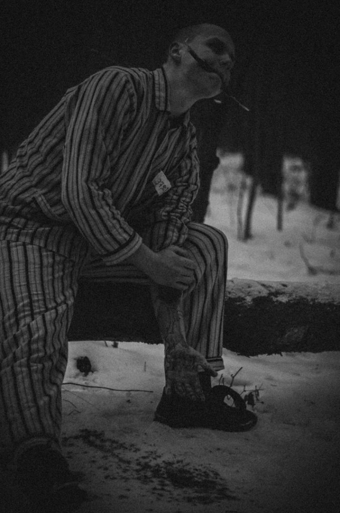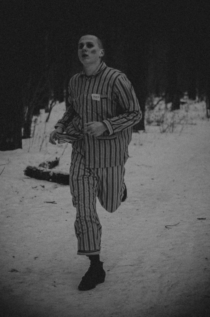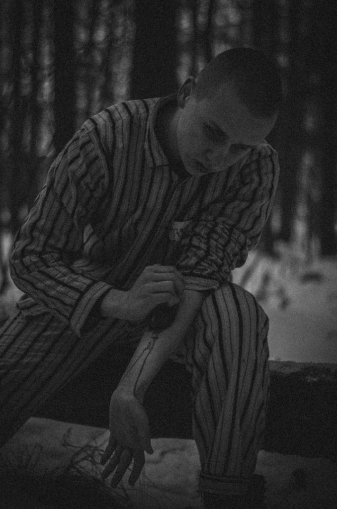 Фотосессию мы проводили в лесу. Долго искали подходящее место: по закону подлости в кадре все время оказывалось что-то постороннее.  Больше всех досталось Жене. Одетый в полосатую пижаму с лагерным номером, с гримом на лице, он стал моделью для моих снимков. Усталый, замерзший, но несломленный – таким он и запечатлен на фото.