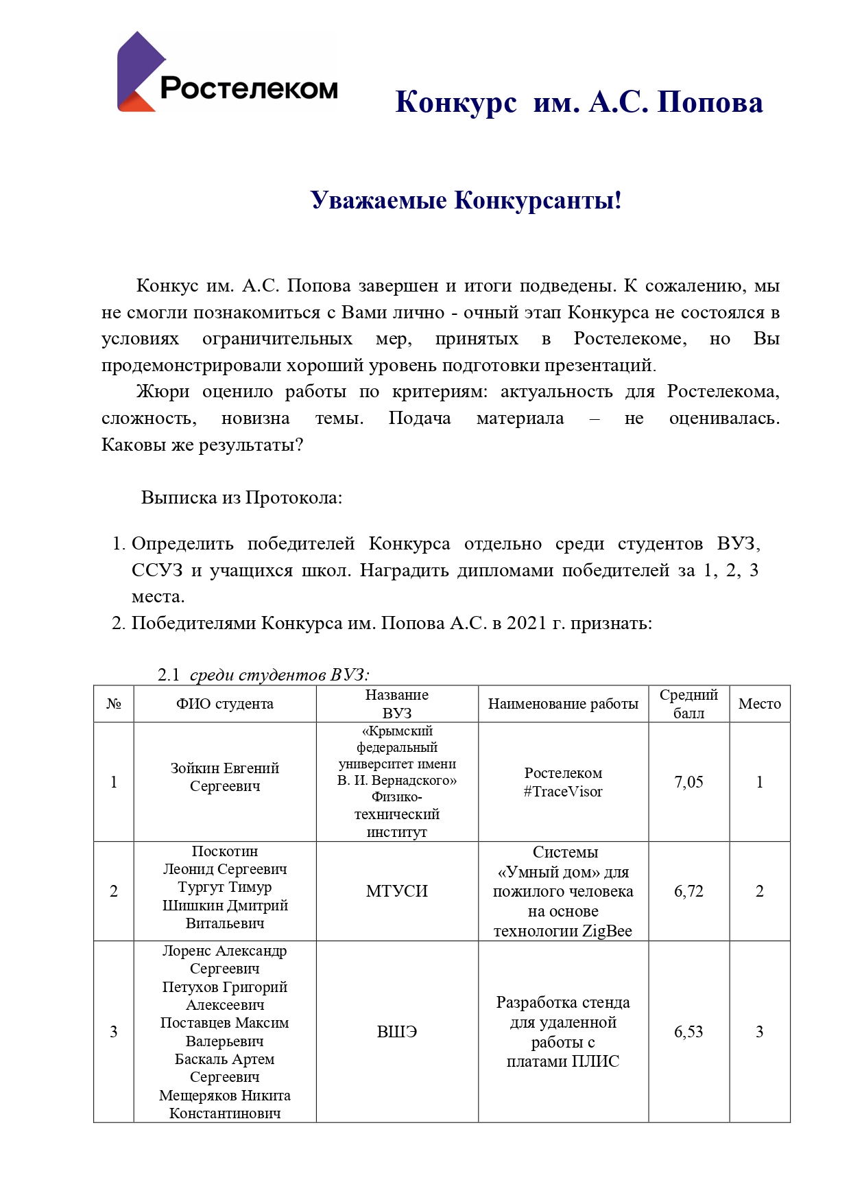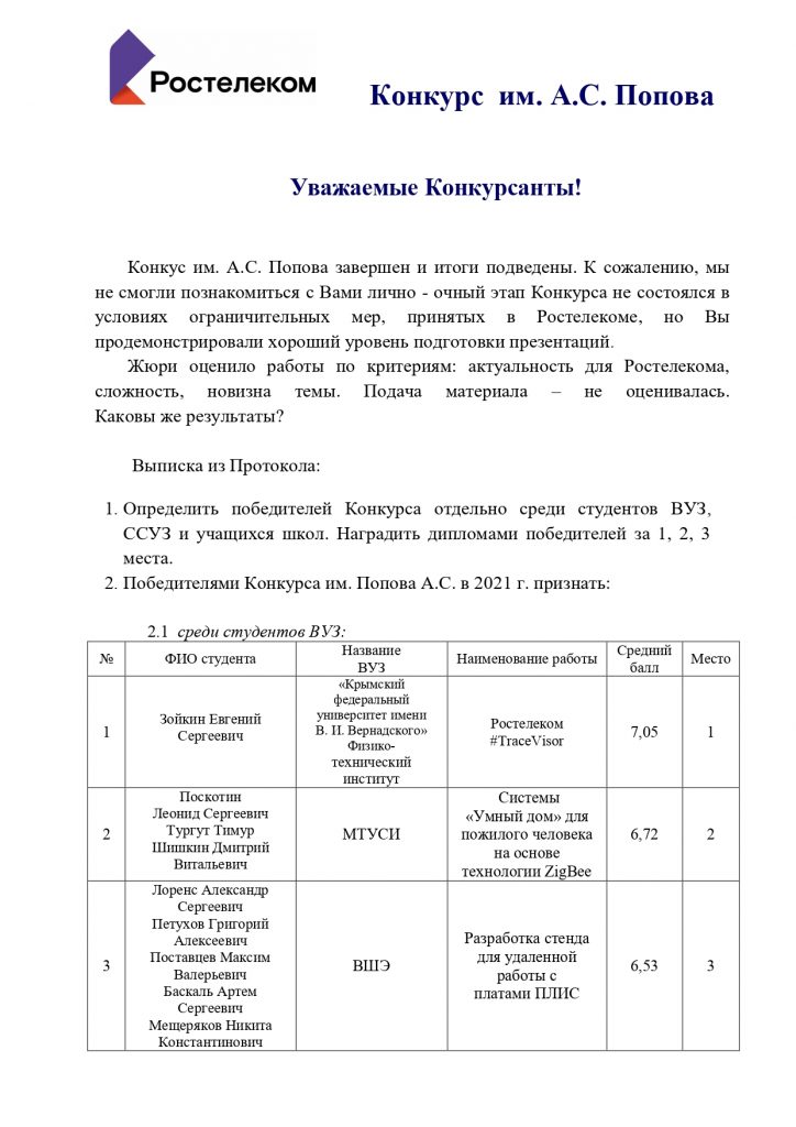 Итоги конкурса им. А. С. Попова