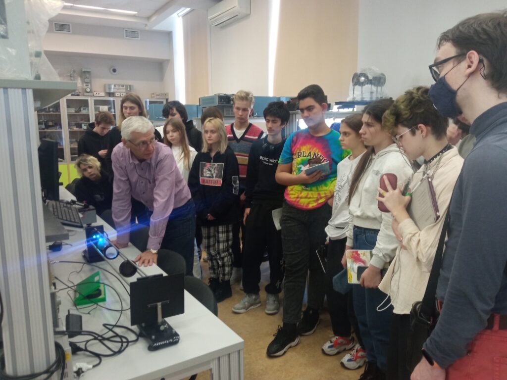 В ходе экскурсии в Дом физики доцент кафедры физики, к.т.н. Николай Антонович Задорожный познакомил студентов МТКП с учебными и научно-исследовательскими лабораториями, продемонстрировал работу оборудования, исследующего оптические свойства прозрачных сред, а также показал, как на практике применяется метод рефрактометрии. Участники экскурсии провели измерение показателя преломления жидкостей с использованием рефрактометра Аббе, измерение показателя преломления светофильтров, тонких пленок, жидкостей с использованием интерферометра Рэлея.