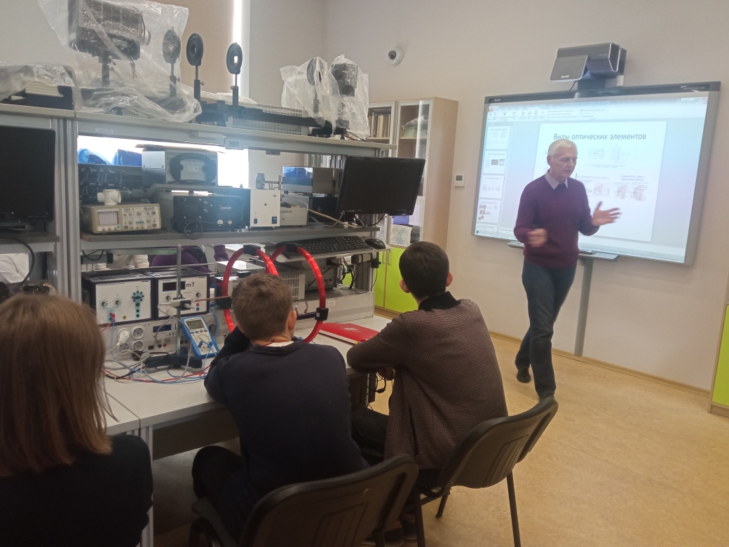В ходе экскурсии в Дом физики доцент кафедры физики, к.т.н. Николай Антонович Задорожный познакомил студентов МТКП с учебными и научно-исследовательскими лабораториями, продемонстрировал работу оборудования, исследующего оптические свойства прозрачных сред, а также показал, как на практике применяется метод рефрактометрии. Участники экскурсии провели измерение показателя преломления жидкостей с использованием рефрактометра Аббе, измерение показателя преломления светофильтров, тонких пленок, жидкостей с использованием интерферометра Рэлея.