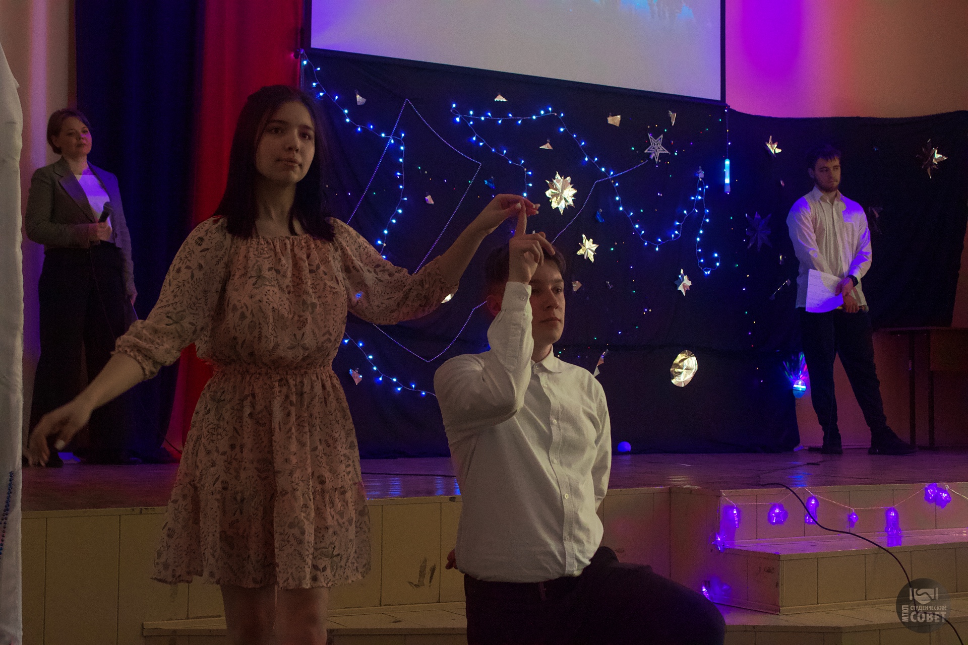 … Представьте, что очень давно, 78 лет назад, из Волховского переулка в путешествие отправился огромный космический корабль под названием «МТКП». Цель полета — Светлое будущее. С Днем космонавтики всех поздравил капитан корабля, хранитель артефакта «Сердце педагога», Владимир Анатольевич Киреев. А далее последовали номера: вальс «Прощание с Землей», космический фаербол, битва на световых мечах, акробатические номера программистов, парад планет – презентация получаемых в техникуме профессий, песни о Гагарине, о крыльях, которые дают возможность подняться к вершинам профессионального мастерства, световые эффекты, прекрасная хореография. Зал встречал выступающих тепло, а порой даже восторженно.