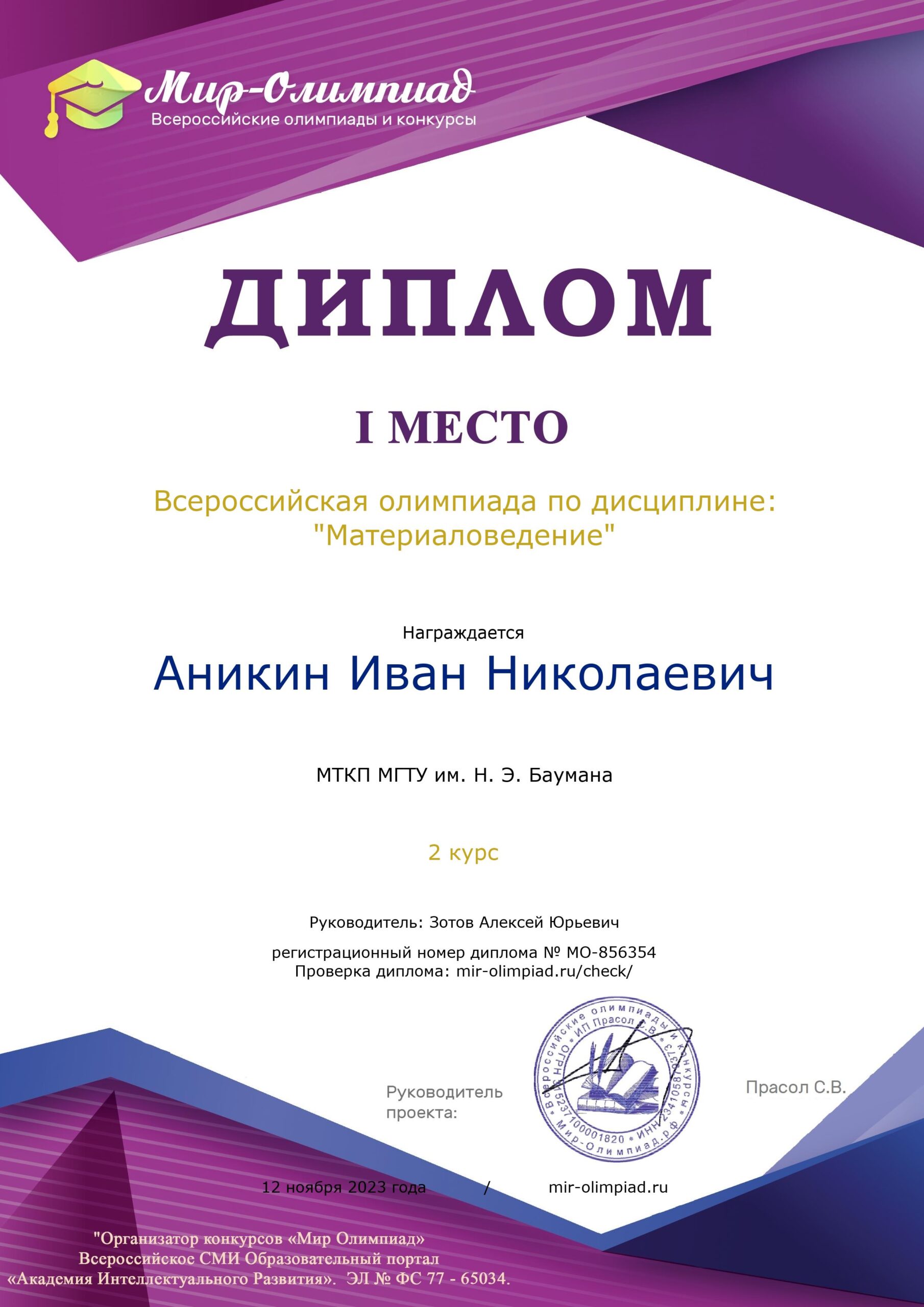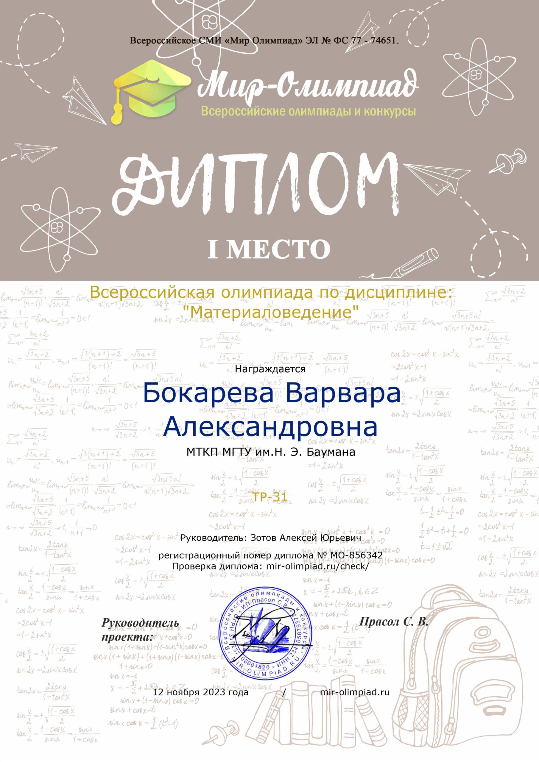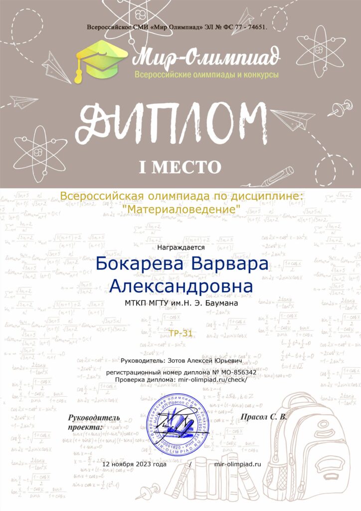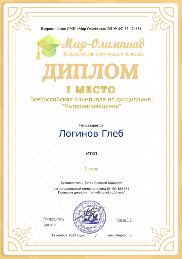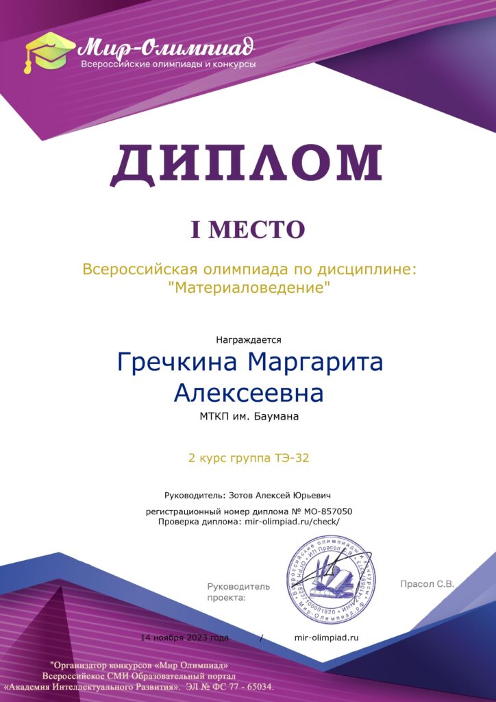 В ноябре 2023 года студенты МТКП МГТУ им.Н.Э.Баумана  приняли участие во Всероссийской олимпиаде по дисциплине «Материаловедение.  Мероприятие было подготовлено и проведено всероссийским СМИ «Мир олимпиад». Варвара Бокарева (ТР-31), Глеб Логинов (ТЭ-32),  Маргарита Гречкина (ТЭ-32), Сондык Александра (ТЭ-31), Александр Жаворонков (ТУ-31) и Иван Аникин (ТМР-32) стали победителями Олимпиады, завоевав I места в различных номинациях. Подготовку обучающихся к интеллектуальным соревнованиям, а также организационно-методическое сопровождение участия в Олимпиаде осуществлял преподаватель профессиональных дисциплин, руководитель кружка «Технология композитов» А.Ю. Зотов. Подробнее о соревнованиях рассказывает преподаватель.