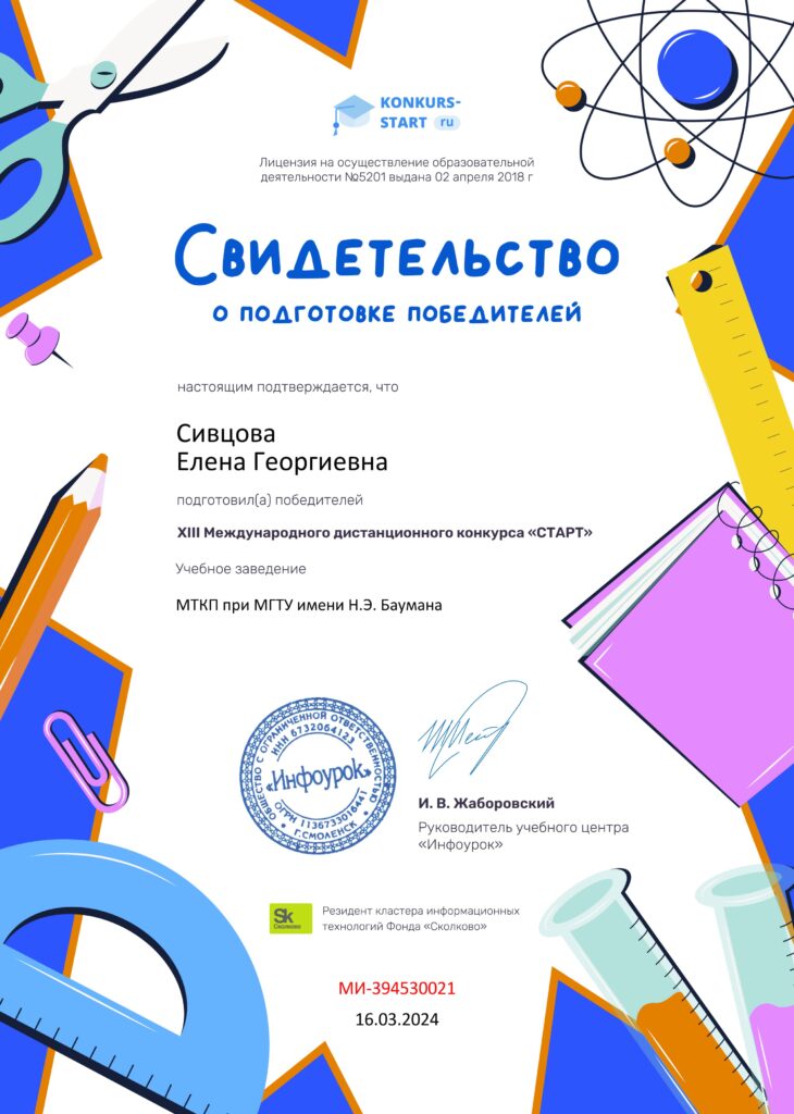 Благодарим преподавателя информатики Е.Г. Сивцову, которая регулярно привлекает наших студентов к участию в различных активностях, связанных с изучением информатики, и поздравляем победителей!