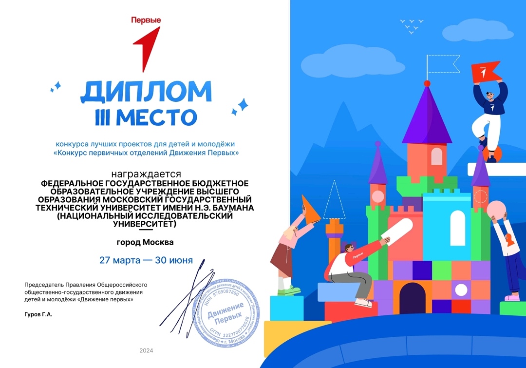 В марте – июне 2024 года состоялся Всероссийский конкурс молодежных проектов «Конкурс первичных отделений Движения первых». По итогам Конкурса команда первичного отделения Общероссийского движения детей и молодежи МТКП МГТУ им. Н.Э. Баумана завоевала III место. Всего же в Конкурсе приняли участие около 2000 команд из разных регионов России.