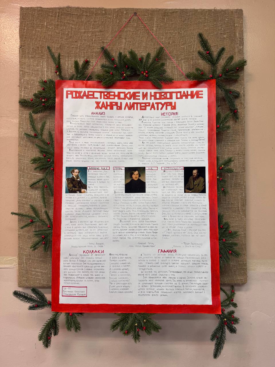Авторы стенгазет ознакомились с историей праздничных литературных жанров, прочитали, а затем пересказали и проиллюстрировали тематические литературные произведения русских и зарубежных писателей. Среди произведений – «Ночь перед Рождеством» Н.В. Гоголя, «Ангелочек» Л.Андреева, «Рождественская песнь в прозе: святочный рассказ с привидениями» Ч. Диккенса, «Дары волхвов» О.Генри и даже рассказ собственного сочинения.