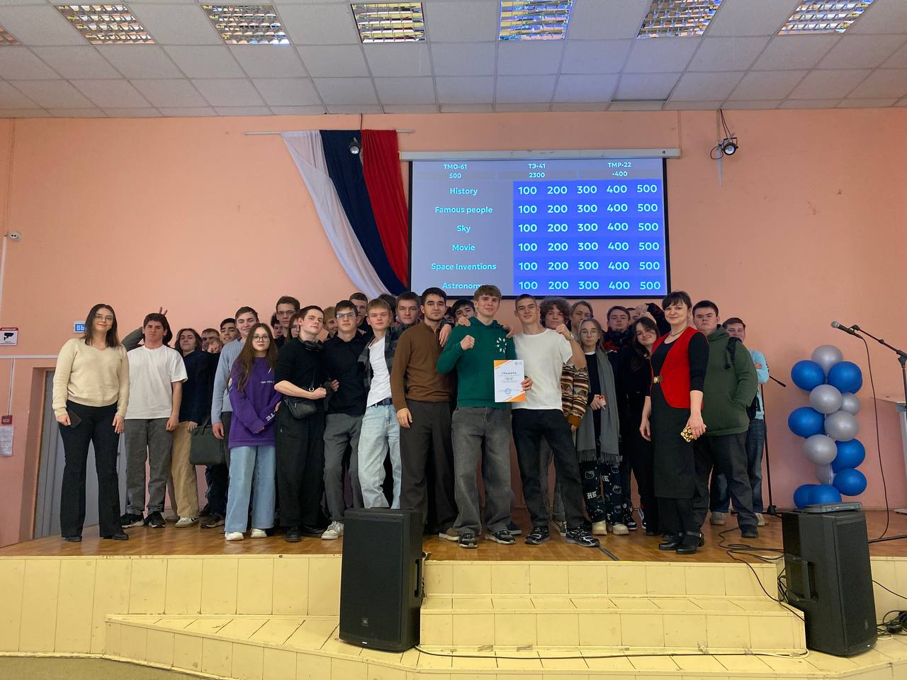 Участниками викторины – команды ТМР-22, ТЭ-41 и ТМО-61 (всего – 52 человека), должны были ответить на вопросы, касающиеся астрономии, истории космонавтики, известных ученых, инженеров, космонавтов и даже тематических фильмов. Ответы оценивали эксперты – преподаватели иностранного языка. Победила группы ТЭ-41, набравшая наибольшее количество баллов благодаря использованию эффективной командной стратегии.
